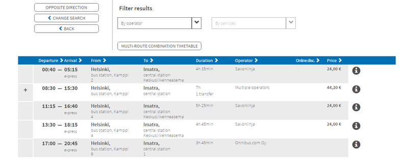 Приобрести билет можно через интернет на сайте транспортной компании OnniBus и Matkahuolto.