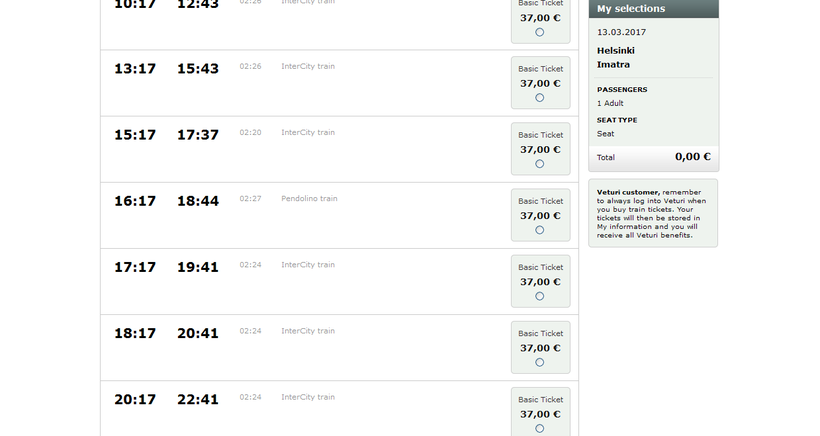 Проезд на поезде из Хельсинки в Иматру обойдется в 37 евро.