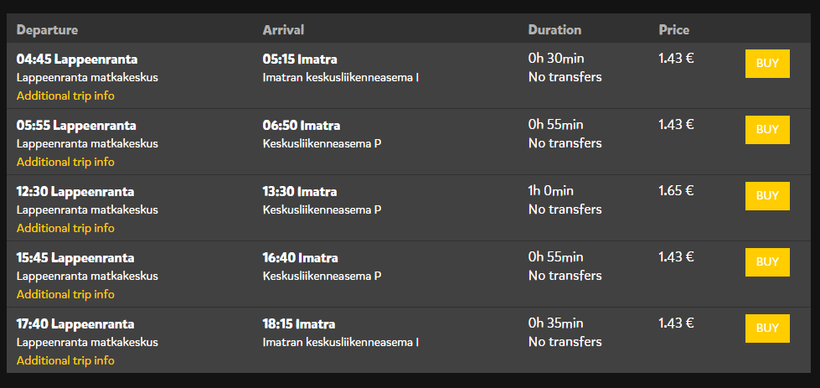 Ниже приведена информация о том, сколько часов вам потребуется, чтобы добраться от Лаппеенранты до Иматры, а также приведена примерная стоимость проезда (средняя цена билета) на том или ином виде транспорта.