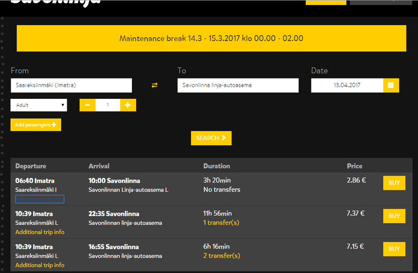 Я советую покупать билеты через официальный сайт компании «Savonlinia». Если по каким-то причинам желания пользоваться интернет сервисами у вас нет, то можете попробовать купить билет прямо у водителя.