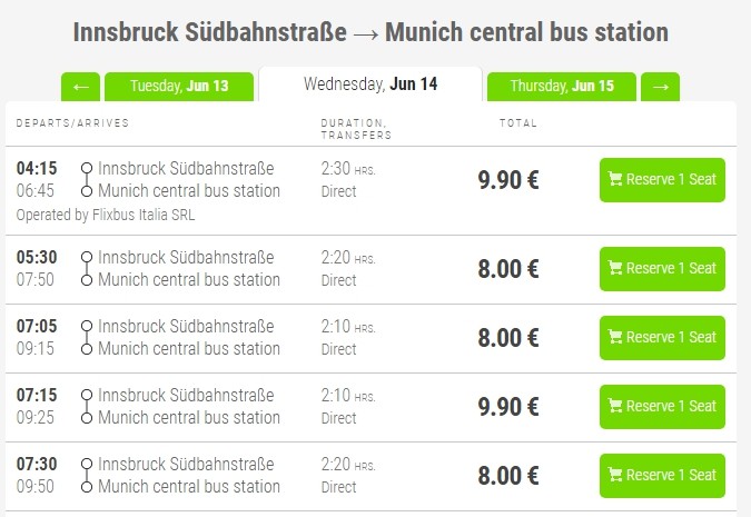 Одним из самых популярных способов добраться из Инсбрука в Мюнхен является автобус. Такой вывод я сделала после того, как посмотрела количество доступных рейсов для такого маршрута.