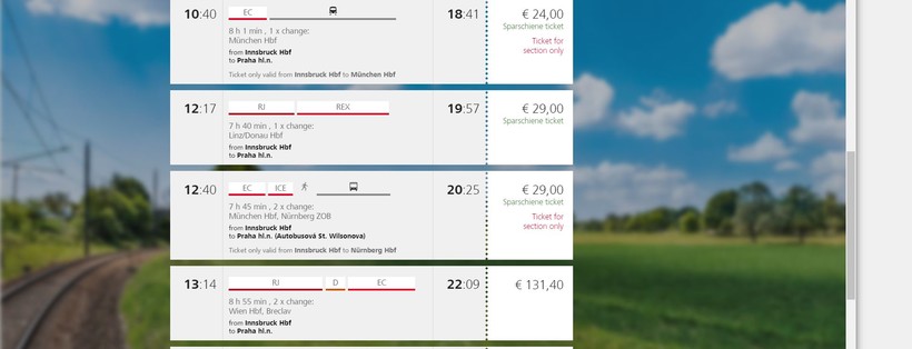 Железнодорожное сообщение с Прагой, разумеется, тоже есть. Прямых рейсов по данному маршруту практически нет и купить на них билеты довольно сложно, поэтому скорее всего придется рассчитывать только на маршруты с пересадками. Выбор очень большой, поэтому я советую обращать внимание только на такие, в которых пересадка только одна. Вот скриншот с таким рейсом (отправка в 12:17):