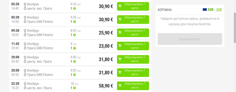 Ниже приведена информация о том, сколько часов вам потребуется, чтобы добраться от Инсбрука до Праги, а также приведена примерная стоимость проезда (средняя цена билета) на том или ином виде транспорта.