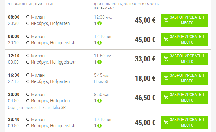 Ниже приведена информация о том, сколько часов вам потребуется, чтобы добраться от Милана до Инсбрука, а также приведена примерная стоимость проезда (средняя цена билета) на том или ином виде транспорта.