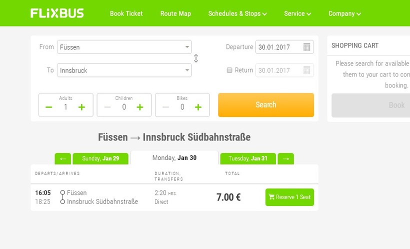 Он прямой, от Фюссена до Инсбрука идет без пересадок. Ходит каждый день, но один раз. Отправляется в 16:05, а прибывает в 18:25. В пути 2 часа 20 минут. В салоне имеется бесплатный Wi-Fi и туалет.