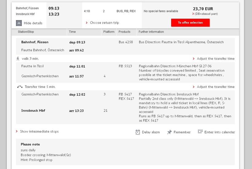 Еще пользуется популярностью вариант для тех, кому неудобен такой график автобусов, который описан выше. Этот вариант с двумя пересадками. Такой маршрут есть у компании Deutsche Bahn. Сначала на автобусе 4258 до станции Reutte Bahnhof, Österreich, потом перейти на ж/д станцию Reutte in Tirol и на поезде ехать до Garmisch-Partenkirchen, а здесь пересесть на другой поезд, следующий до Инсбрука. В пути придется провести около 4 часов.