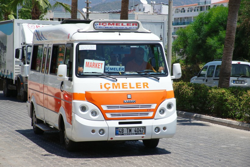 Остановить долмушу можно практически где угодно. В случае чего, увидев такой автобус нужно просто помахать рукой, и он остановится прямо возле потенциального пассажира. Любой автобус с оранжевой ливреей везет в Ичмелер, тут уж точно не промахнешься никак. В среднем, дольше 20 минут ждать долмушу не приходится. Ходят они примерно с семи утра до пол-второго ночи, так что уехать можно большую часть суток.