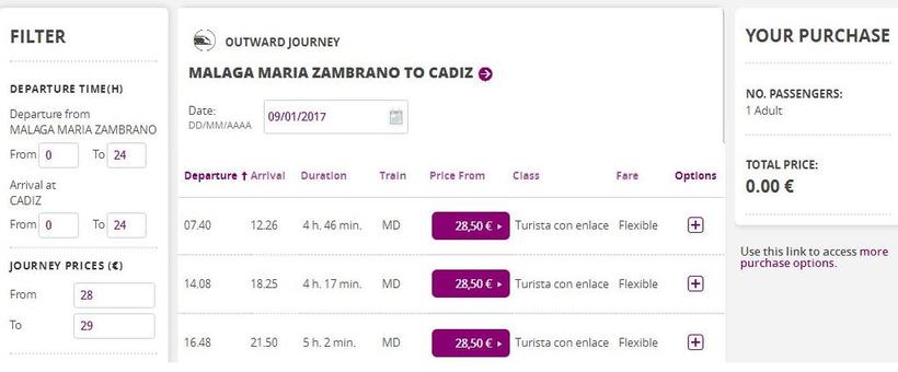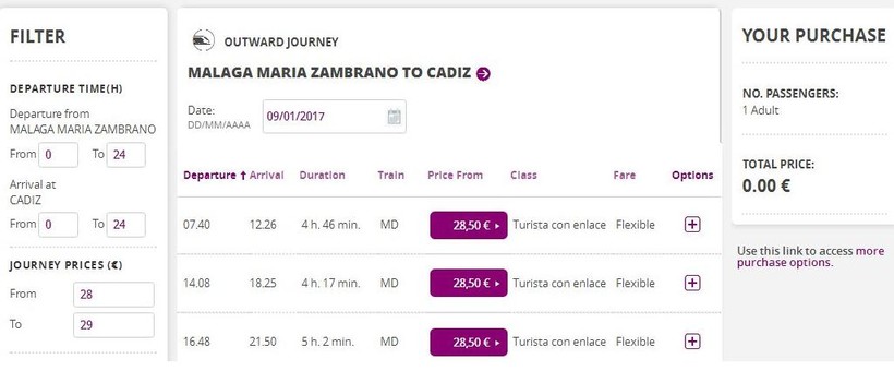 Если смотреть расписание на официальном сайте ЖД Испании, может создаться впечатление, что между Малагой и Кадисом курсируют прямые поезда MD. На самом деле это не так, нужно сделать одну пересадку в городе DOS HERMANAS. Волноваться об этом не стоит, так как на то, чтобы пересесть из поезда в поезд, в расписании заложено достаточно времени. От вокзала MARIA ZAMBRANO в Малаге, который находится на Explanada de la Estacion, ежедневно есть отправления в такое время: 07:40, 14:08, 16:48. По пятницам и воскресеньям к ним добавляется еще рейс в 19:00. Весь путь до Кадиса, с учетом пересадки, должен занять от 4 ч 17 мин до 5 ч. Поезда приезжают на станцию Кадиса, которая расположена на площади Севильи. Непосвященному человеку сразу разобраться во всех категориях поездов и принципах тарификации проезда довольно непросто, поэтому я советую почитать об этом статью, где все изложено простым языком.