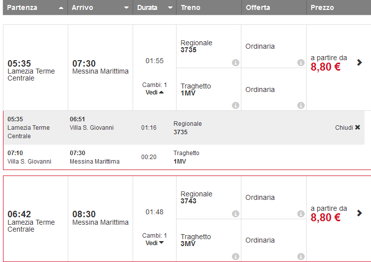 Стоимость проезда зависит от маршрута. Если из Ламеции в Мессину можно доехать за 8,80 евро, то поездку в Палермо придется заплатить уже не меньше 20. Советую заранее приобрести билет, так как в день поездки проезд может подорожать раза в 1,5-2.