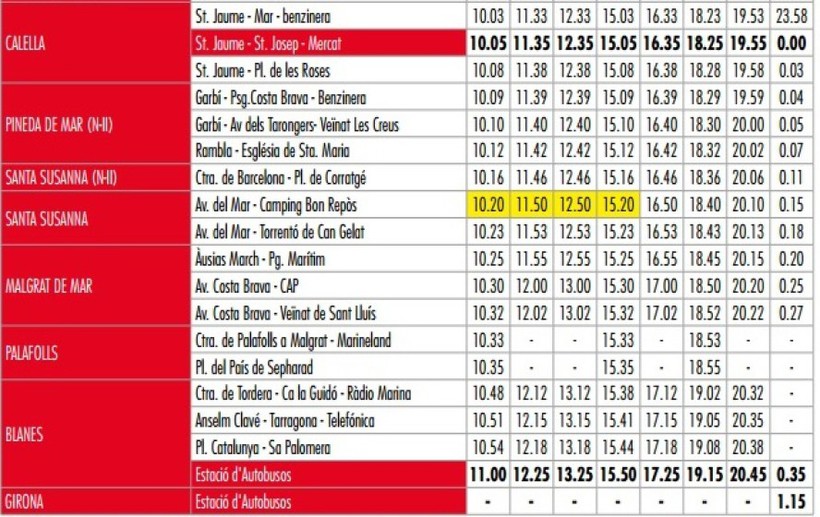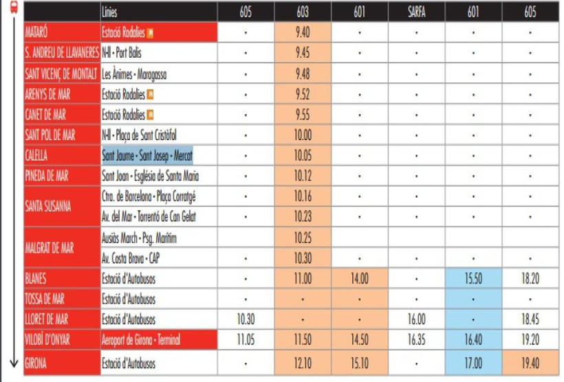 Хочу сразу расстроить тех туристов, которые любят путешествовать на автобусах. Из города в Жирону есть только один дневной автобусный рейс линии 603. Следует он из Матаро и в Калелье отправляется с остановки Sant Jaume - Sant Josep – Mercat в 10:05. Ниже в расписании время отправления этого рейса с каждой остановки выделено оранжевым цветом.