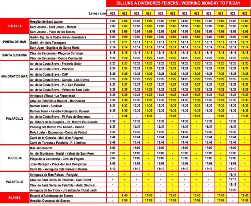 Для поездки в Бланес также подойдет также линия 622. Вот расписание этих автобусов.