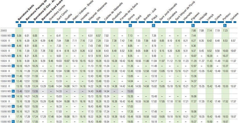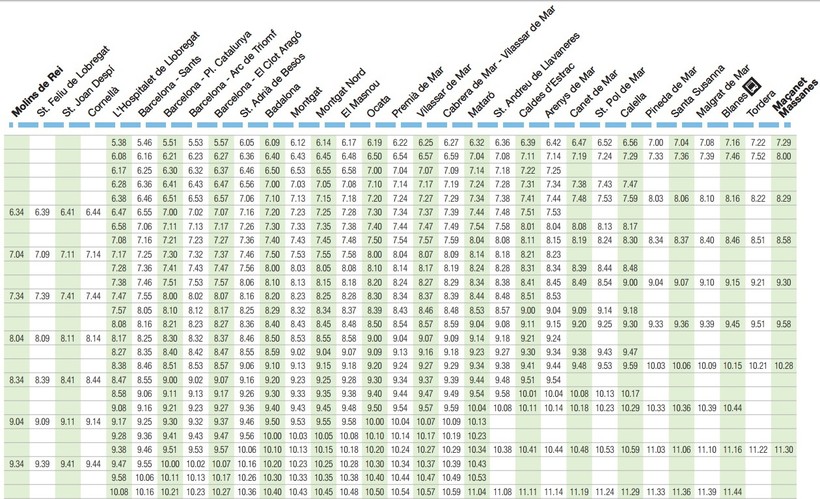 Теперь о расписании. В направлении станции Macanet-Massanes ежедневно с 07:00 до 24:00 курсирует более двадцати электричек линии R1. Вот фрагмент расписания.