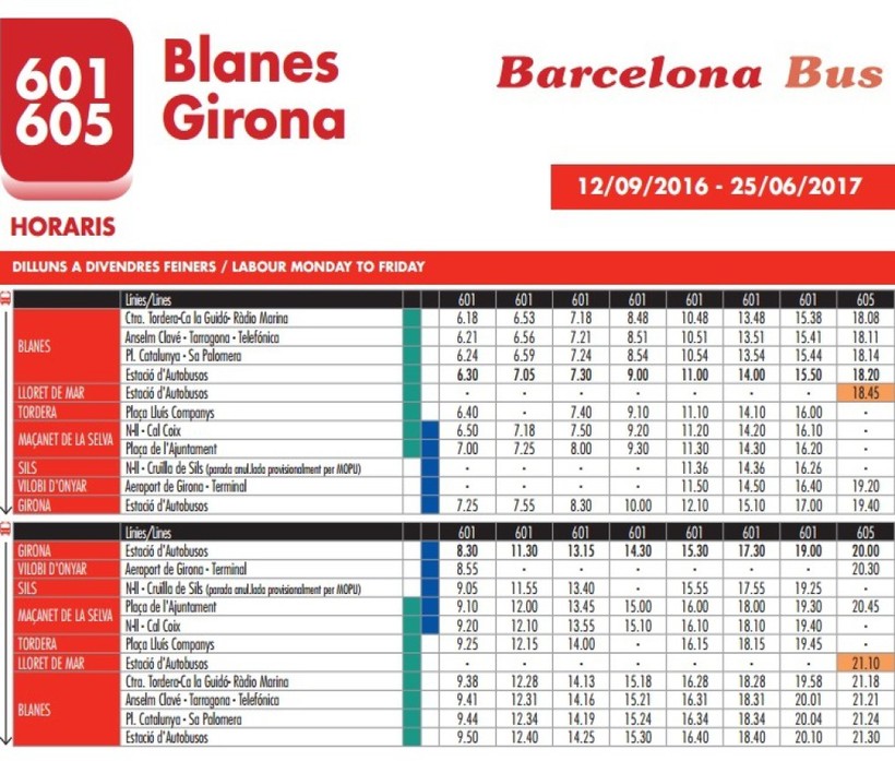 По выходным и праздничным дням перевозки не осуществляются. Ехать на этом автобусе будете два часа. Есть еще один рейс линии 603, который отправляется из Барселоны в Жирону через Калелью в 00:00.