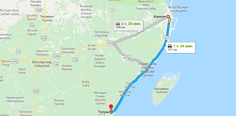 Тулум находится всего в 130 км от Канкуна, и это расстояние на машине можно проехать за 2 часа.