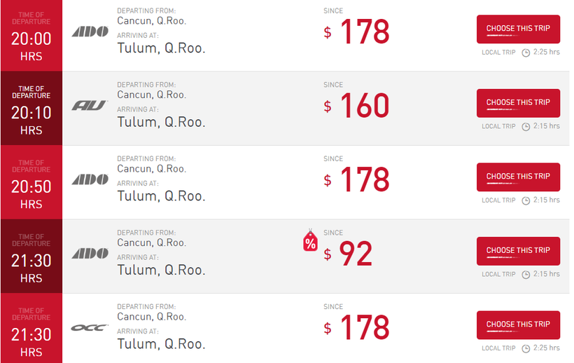 В среднем поездка на автобусе из Канкуна в Тулум обойдется в 160–178 песо (около 9$ или 600 руб.), но можно найти билеты и за 90 песо (примерно 5$ или 330 руб.).
