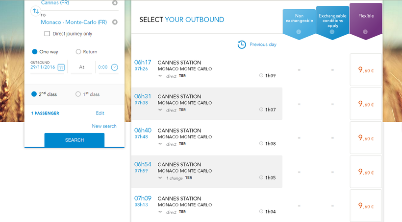 Поезда в Монте-Карло из Канн курсируют в течение всего дня с раннего утра (первый поезд отправляется в 06:17) и до позднего вечера (последний отбывает в Монако в 22:27). Подавляющее большинство рейсов прямые, и только некоторые маршруты предусматривают пересадку в Ницце. На длительность проезда это никак не влияет – в дороге нужно будет провести около часа.