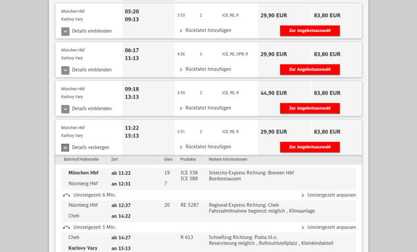 Если на сайте Bahn поискать поезда из Мюнхена (Munich (München) в Карловы Вары (Karlovy Vary), то вы увидите несколько комбинаций поездов с 2 и 3 пересадками. Поезда ездят до станций Karlovy Vary и Karlovy Vary dolni n. Поездка с 2 пересадками занимает 4 часа, она подразумевает переезд на экспрессе ICE до Нюрнберга, а затем поездку на двух электричках с пересадкой в Хебе (Cheb). Билет стоит минимум 30 евро.