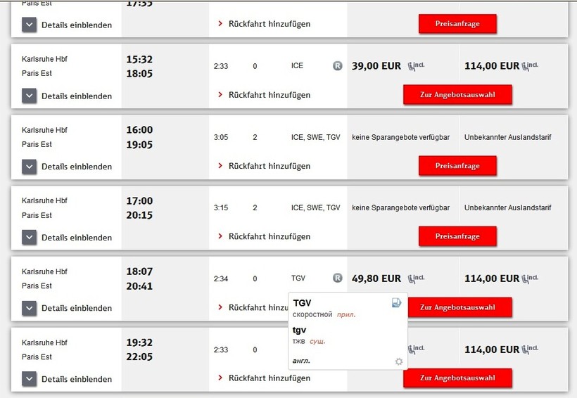 На сайтах Bahn и TGV. Поэтому смотреть расписание и приобретать билеты можно на том сайте, который для вас наиболее удобен.