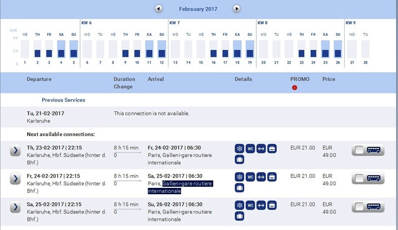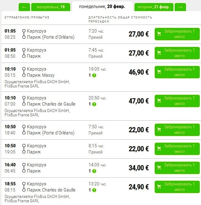 Автобусы Евроланйс отправляются по четвергам, пятницам, субботам и воскресеньям. Это ночные рейсы. Они покидают Карлсруэ в 22:15. Через 8 часов прибывают в Париж. По дороге можно полноценно выспаться.