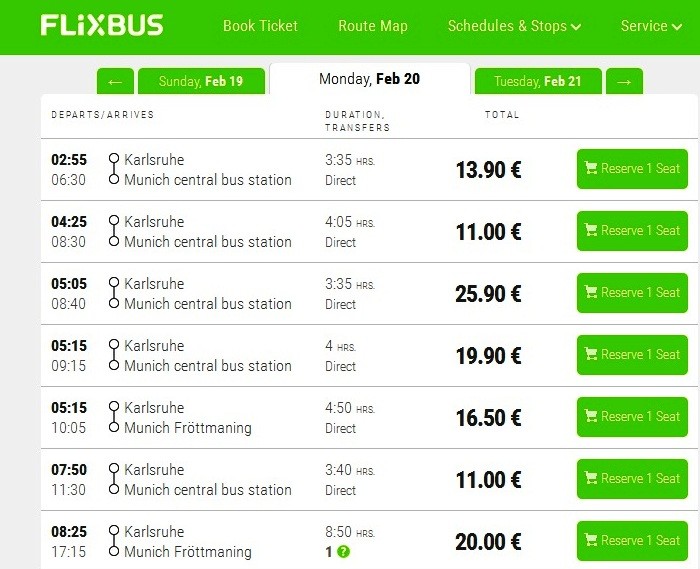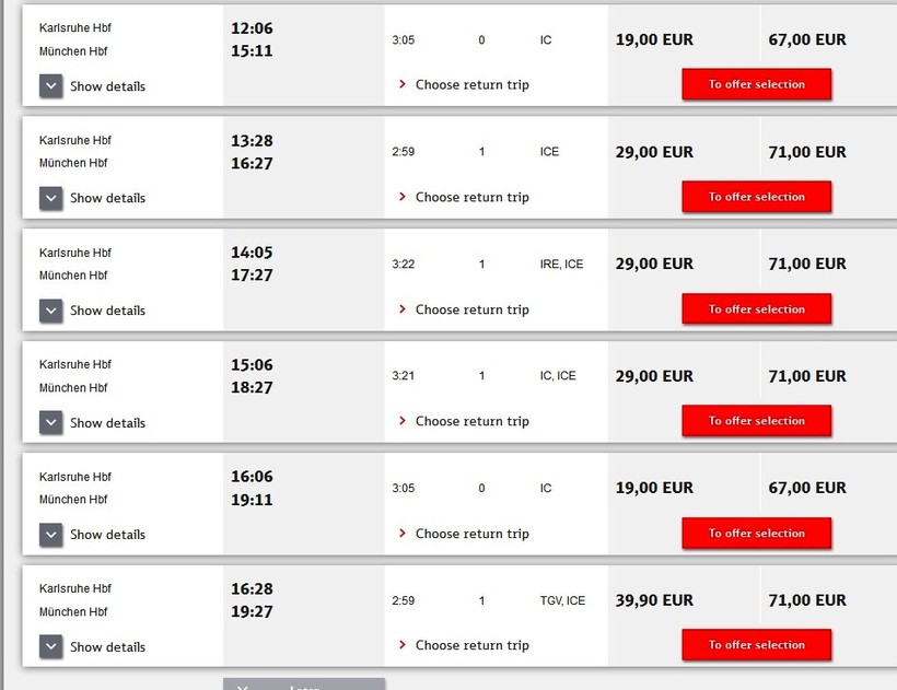 Время отправления первого поезда – 2:11 ночи. Следующий состав покинет центральную железнодорожную станцию Карлсруэ уже в 4:55. Затем рейсы отправляются регулярно в течение дня. Последний поезд в Мюнхен уходит в 21:06. В Мюнхене поезд прибывает на Центральный вокзал.