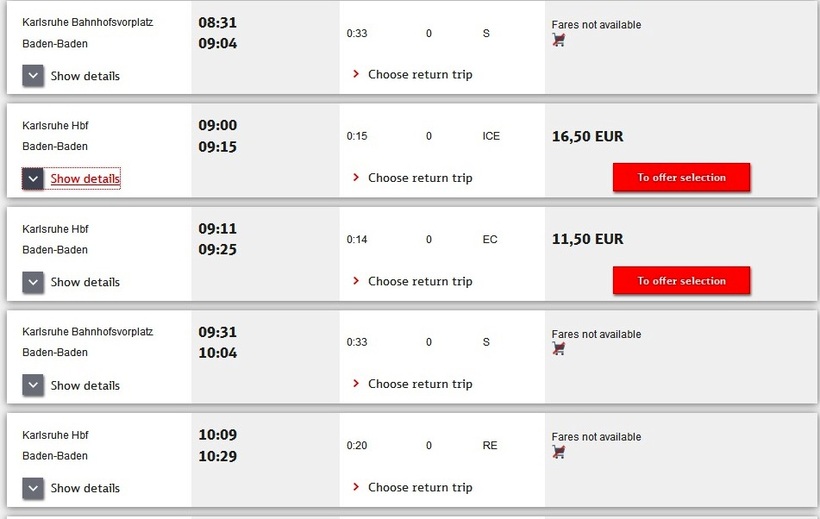 Поездка займет от 14 до 35 минут в зависимости от выбранного класса поезда. В среднем же на дорогу уходит около 20 минут. Станция отправления - Центральный вокзал Карлсруэ. Станция прибытия – единственный в Баден-Бадене железнодорожный вокзал.