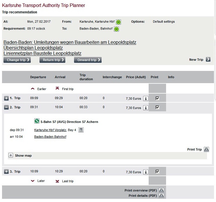 Пусть этот подзаголовок вас не удивляет. Одни называют составы компании S-Bahn S7 трамваем, другие электричкой. Но суть в том, что для того чтобы воспользоваться этим транспортом вам не нужно добираться до ЖД вокзала Карлсруэ. Начальной станцией движения будет Karlsruhe Hbf Vorplatz, а конечной - Baden-Baden Bahnhof. Трамвай отправляется раз в час в 9:30, 10:30 утра и так далее. Время в пути около получаса. Полный круг трамвай совершает за час.