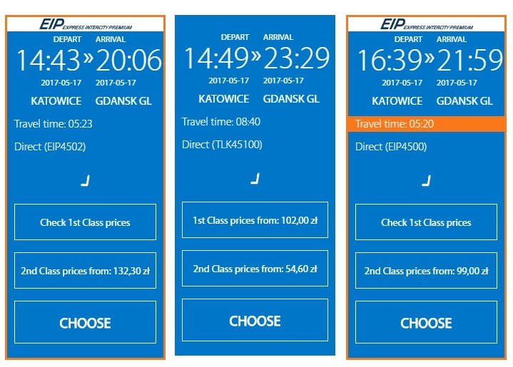 Билет на поезд во второй класс можно купить за 55-132 злотых (14-33 евро) в зависимости от рейса. Поездка в комфортном первом классе обойдется почти в два раза дороже.