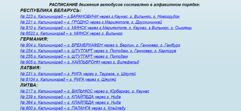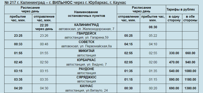 Через Каунас проходит несколько транзитных автобусов, что направляются из Минска, Барановичей, Вильнюса именно в Калининград.