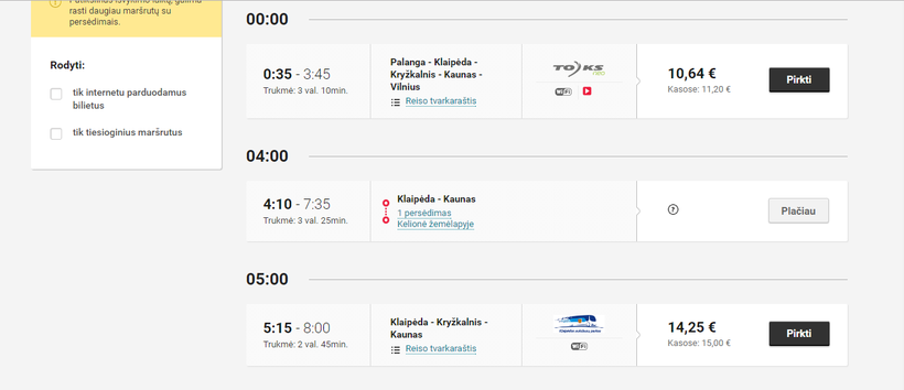 Ниже приведена информация о том, сколько часов вам потребуется, чтобы добраться от Клайпеды до Каунаса, а также приведена примерная стоимость проезда (средняя цена билета) на том или ином виде транспорта.