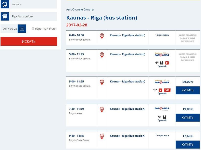Ежедневно есть 4 прямых рейса. По времени поездка занимает от 4 до 6 часов, смотря какой маршрут. Во всех автобусах Eurolines предоставляется бесплатный Wi-Fi, а в некоторых еще и мультимедийная система. Сиденья у этого перевозчика комфортные, места для ног достаточно, есть кондиционеры. Все рейсы отправляются от автовокзала Каунаса (на Vytauto pr. 24), а приезжают на автовокзал Риги (на Prāgas iela 1). Если вы не нашли удобное для себя по времени отправление, тогда можно рассмотреть один из 5-7 вариантов с пересадкой.