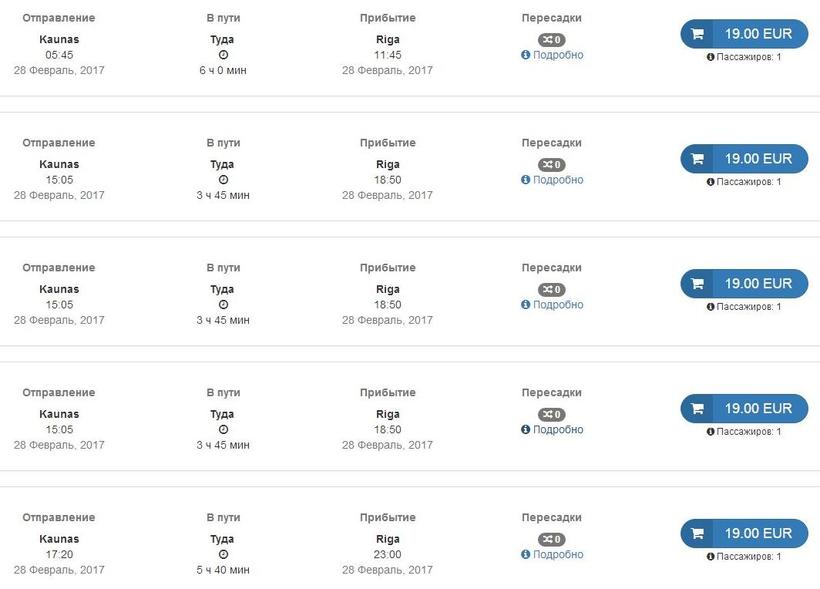 Ниже приведена информация о том, сколько часов вам потребуется, чтобы добраться от Каунаса до Риги, а также приведена примерная стоимость проезда (средняя цена билета) на том или ином виде транспорта.