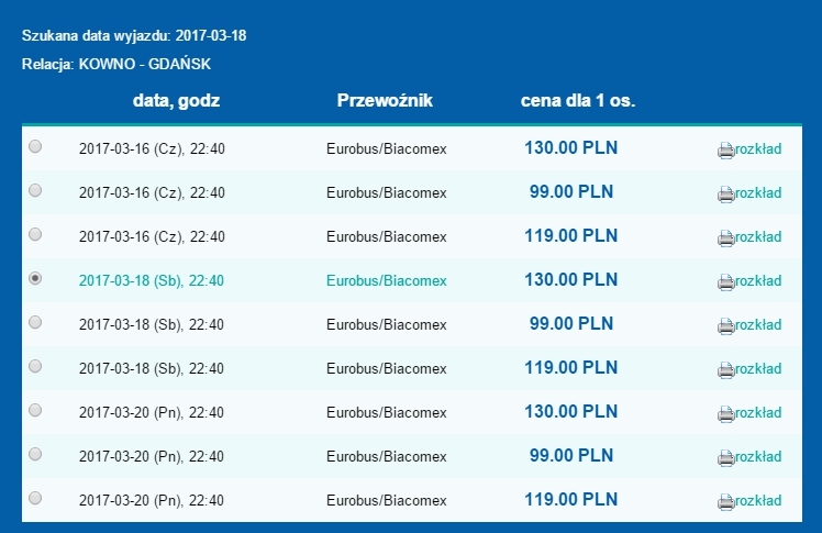 Из Каунаса в Гданьск через день, по четным числам, курсируют прямые автобусы компаний Eurobus/Biacomex. Ночной переезд займет 9 часов, отправление в 22.40 прибытие в 6.40. Расписание можно смотреть как на сайте Eurobus, так и на сайте Biacomex. Автобусы вполне комфортабельные, с туалетом и розетками. В пути делают пять остановок, только для посадки и высадки.