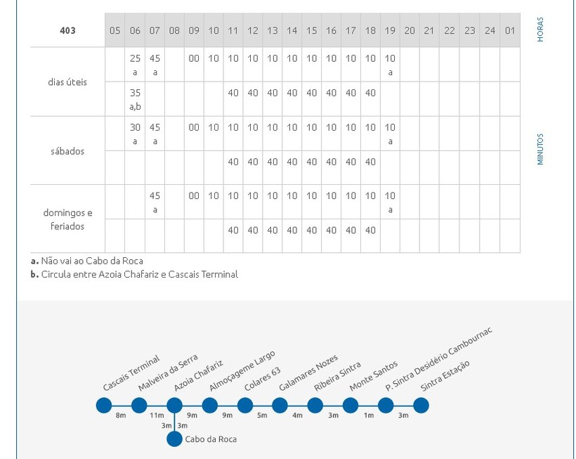 Автобус 403 отходит от первой остановки и едет в Кашкайш с заездом на Мыс Рока. Со второй остановки оправляются автобусы до пляжей и по близлежащим населенным пунктам. Некоторыми из них также можно доехать в Кашкайш.