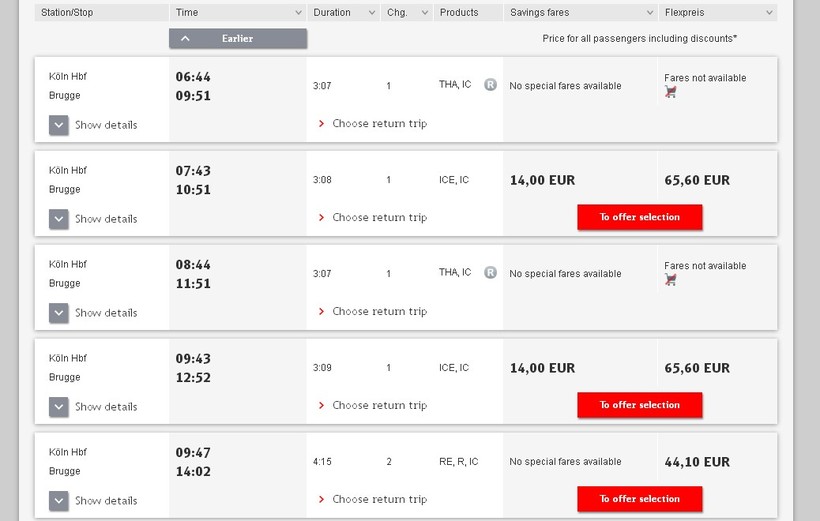 Ниже приведена информация о том, сколько часов вам потребуется, чтобы добраться от Кёльна до Брюгге, а также приведена примерная стоимость проезда (средняя цена билета) на том или ином виде транспорта.
