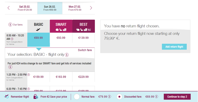 Кто рано встаёт, тому Бог подаёт! А кто заранее бронирует авиабилеты, тот часто натыкается на различные акции и скидки. Проанализировав все возможные варианты, я решил остановиться на перелёте. Из Кёльна в Вену можно долететь самолётом компании «Eurowings», рейсы есть каждый день, такой перелёт занимает всего полтора часа. Аэропорт из которого я вылетал называется Кёльн/Бонн, он находится примерно посередине между этими городами и обслуживает оба. Проще всего туда добраться на электричке S-bahn, это всего 15 минут пути от Центрального ЖД вокзала. Аэропорт прибытия называется Вена-Швехат, оттуда до города также можно за 15 минут добраться на электричке.