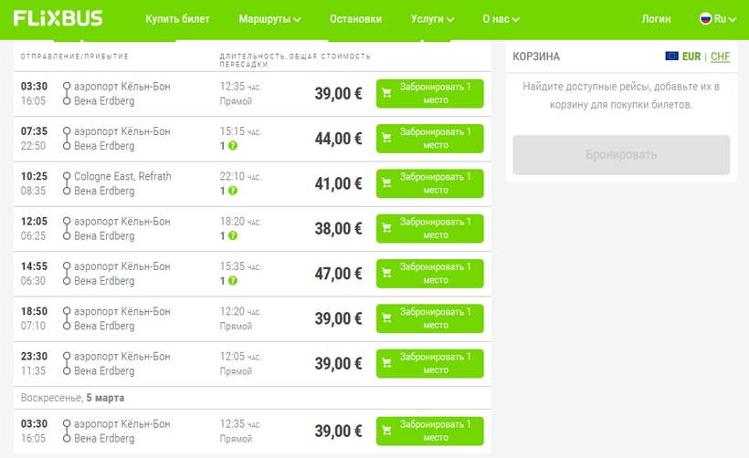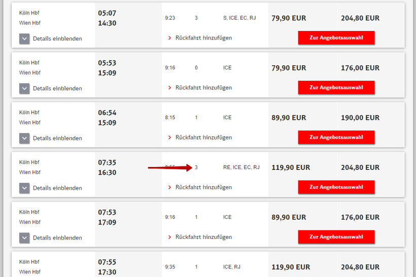 Вот так выглядит сайт «Deutsche Bahn», стрелочкой я показал количество пересадок на рейсе.