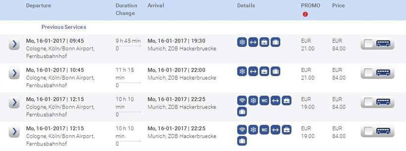 Автобусный перевозчик Евролайнс совершает прямые рейсы до Мюнхена от остановки возле аэропорта Köln/Bonn. Мне такой вариант не подходил, но тем, кто прилетел в Кельн, а поселиться решил в Мюнхене, будет очень даже удобно. Ежедневно есть такие отправления: в 09:45 и 12:15, а по понедельникам добавляется еще одно – в 10:45. Через 10-12 часов пути автобусы прибывают на автовокзал Мюнхена по адресу Hackerbrücke 4, это в одном километре от Главного ЖД вокзала.