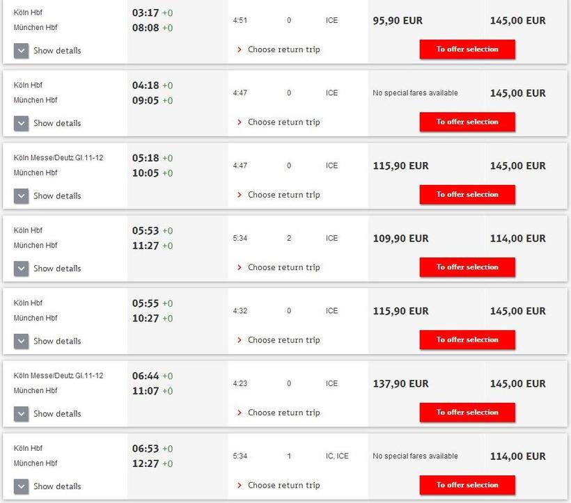 Масса прямых поездов отправляется от Köln Hbf, они выезжают буквально каждые полчаса-час, начиная с 03:17 и заканчивая 22:30.