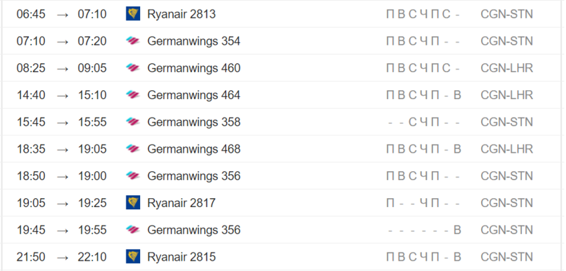 По времени поездка займёт минут 25. Из Кёльна в Лондон перелёты обслуживают несколько авиакомпаний: Ryanair - маде ин Ирландия и Germanwings - немецкого происхождения. Они предоставляют прямые рейсы, довольно бюджетные, которые домчат без пересадок за полтора часа. Расписание указано ниже, или же самостоятельно смотрите на сайтах компаний.