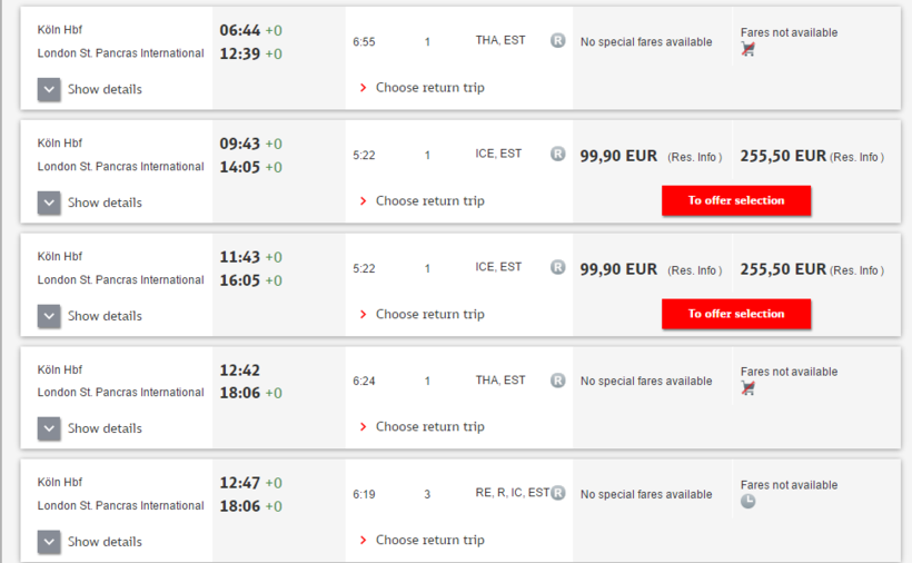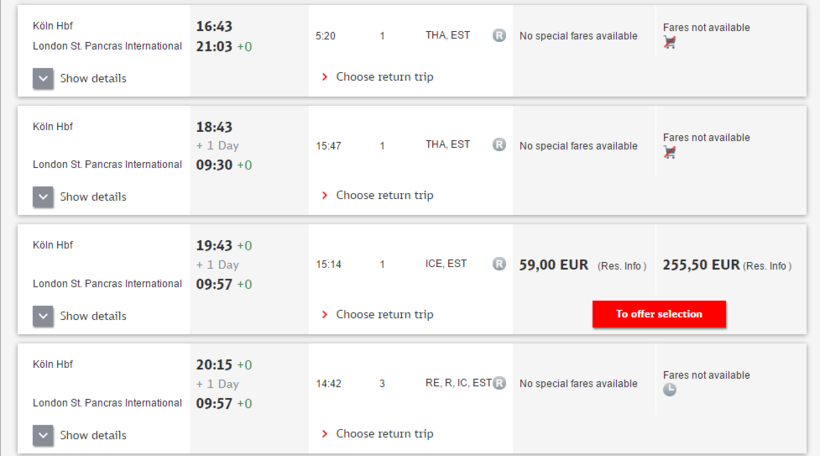 Поездка длится от пяти часов до 15. Пересадок от 1-й до 3-х. Из Кёльна едем в Брюссель, где и пересаживаемся на скоростной поезд Eurostar.