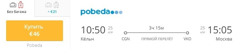 На данный момент из Кельна в Москву есть только один ежедневный рейс. Вылет утром, продлится воздушное путешествие 3 часа и 15 минут. Самолет принадлежит авиакомпании Pobeda.