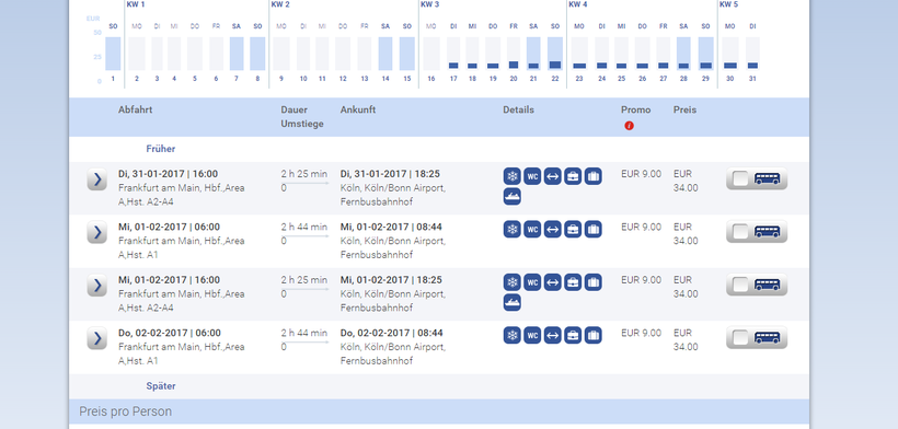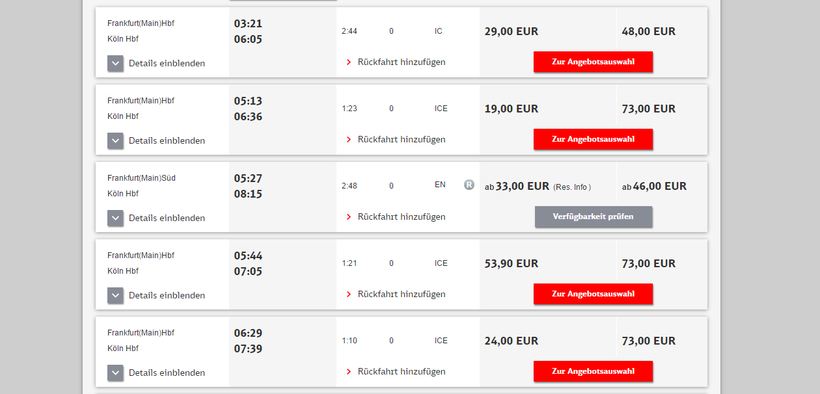 Ниже приведена информация о том, сколько часов вам потребуется, чтобы добраться от Франкфурта-на-Майне до Кёльна, а также приведена примерная стоимость проезда (средняя цена билета) на том или ином виде транспорта.