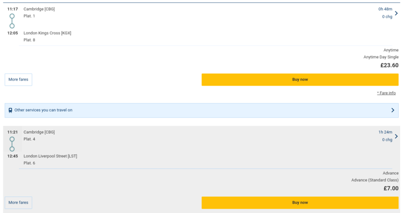 Железную дорогу в Великобритании обслуживают несколько компаний, поэтому расписание движения по участку Кембридж — Лондон можно посмотреть на сайте Great Northern rail или же на общем сайте National Rail. На мой взгляд, они оба не удобные, информация скудная, но что есть, то есть.