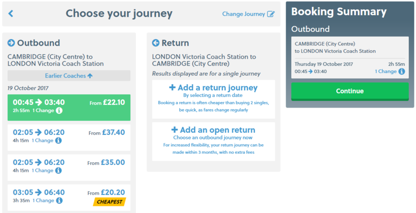 Автобусная остановка в Кембридже носит название Cambridge (City Centre) и находится на Parkside возле Parker's Piece. Время отправления вы найдете на сайте перевозчика, в Лондон ехать не меньше двух часов. Автобусы прибывают на станции London Westminster и London Victoria Coach Station.
