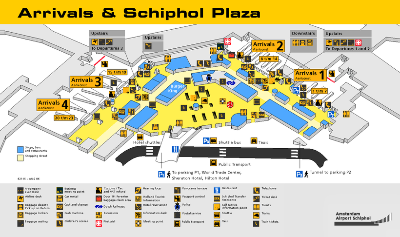 Здание представляет собой большой терминал, который поделен на залы для пассажиров. Все 3 зала связанны между собой переходами. Имейте в виду, что при выходе из самолета прилетающий попадает не на паспортный контроль, как в других аэропортах, а в зал с магазинами. Многие пассажиры блуждают в поисках выхода. Чтобы не потеряться, следуйте за указателями Arrivals hall и Visa check. Получив багаж, вы попадете в Schiphol Plaza.