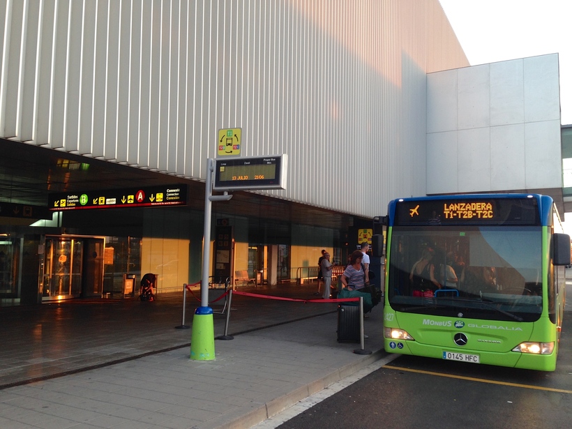 Прежде чем приступать к рассказу о самих методах путешествия между аэропортом и городом поедаю вам о навигации между самими терминалами. Как я уже упоминала выше, - терминалы связывают автобусы-шаттлы. Чтобы туристы не спутали их, с каким либо другими автобусами, - они специально окрашены в зеленый цвет. Если вы прилетели в терминал Т2, то вам нужно дойти до остановки расположенной под мостом, рядышком со зданием Т2В. Если вы прилетели в терминал Т1, то вам можно сказать повезло, идти никуда не нужно – остановка находится прямо перед входом в терминал. Шаттлы между терминалами курсируют каждые 5-7 минут. Я бы отводила на такую поездку примерно полчаса, учитывая то время, которое, вам, возможно, придется ждать шаттл. Также шаттлы ездят и до железнодорожной станции RENFE, однако курсируют они намного реже, - 1 рейс за 30 минут. Прилагаю фото автобуса-шаттла.