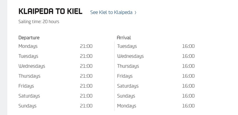 Паромы Клайпеда - Киль отправляются ежедневно в 21:00, расписание можно посмотреть на сайте DFDS: