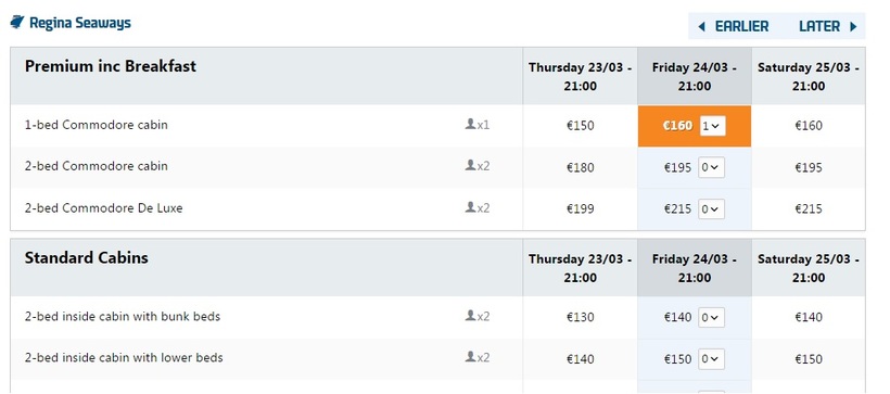Ничего общего с лайнером эти суда не имеют, они предназначены для перевоза пассажиров и транспортных средств, хотя на борту есть кафе и столовая. Цены демократичные, самые дешевые билеты продаются в общий зал, где можно только развалится в кресле. В каюты билеты стоят дороже, есть 4-х местные женские и мужские, 1 и 2-х местные. Проезд в каюте с окном стоит дороже, чем во внутренней.