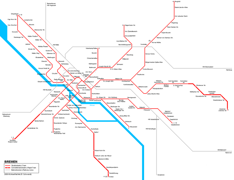 Вам нужно ехать не до конечной остановки, а выйти на остановке «Домсхайде». Для большего удобства, размещаю трамвайную карту Бремена, которая поможет вам разобраться в маршруте.