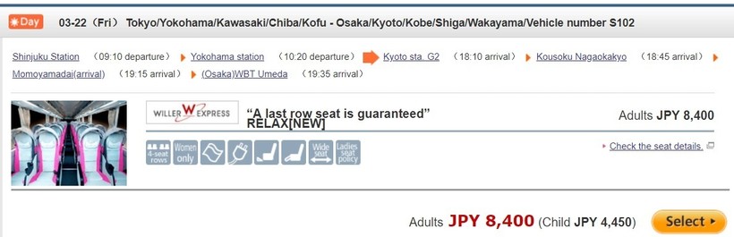 Второй раз я решила сэкономить и совершить путешествие до Киото на автобусе. Путешествовала на автобусе компании Willer travel. Выехала я в 09:10 и в начале седьмого вечера была в Киото. Таким образом, мое путешествие продлилось девять часов. Вы можете зайти на сайт данной компании и посмотреть там подробное расписание на нужный вам день.